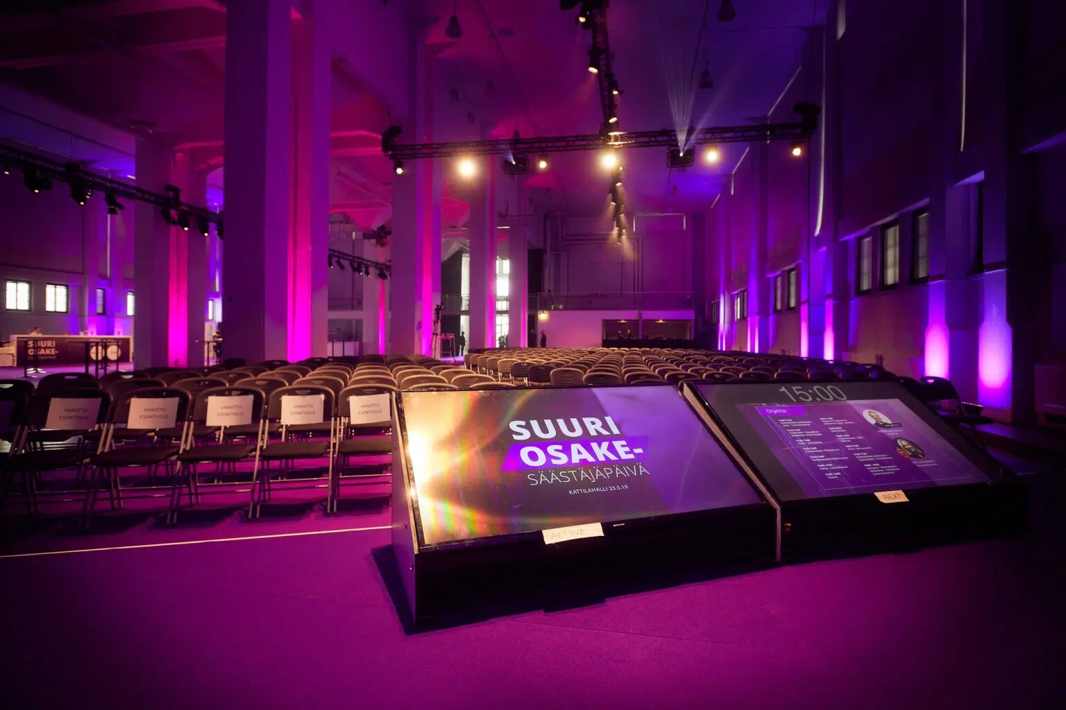 Kokous ja yritystilaisuuksiin voidaan rakentaa pienelläkin investoinnilla näyttäviä ratkaisuita: esimerkiksi vuosikokousten laadukkaat brändätyt ilmoittautumistiskit, puhujakorokkeet ja äänestyslaatikot luovat yritystapahtumaan yhtenäistä, tyylikästä ilmettä. Aina ei tarvitse lähteä omista toimitiloista minnekään, sillä esiintymislavat valoineen, upeat matot sekä taustaseinät loihtivat uutta ilmettä tilaisuuksiin.